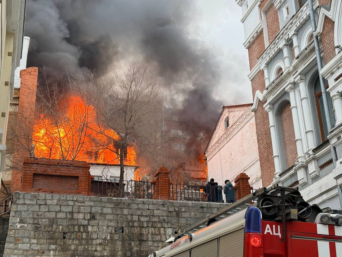❗️Огонь охватил два здания в Почтовом переулке. Для тушения не хватает воды.