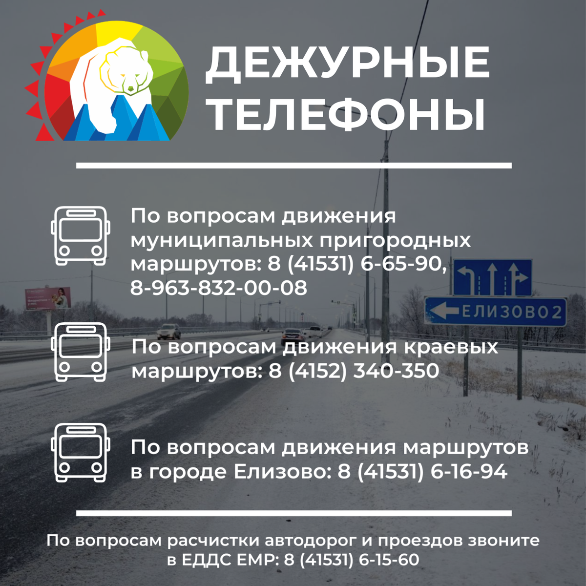 В связи с перебоями в автобусном сообщении из краевой столицы до Елизовского района напоминаем телефоны, по которым можно уточнить информацию о работе маршрутов. По вопросам движения автобусных маршрутов информацию уточняйте по следующим телефонам: — городские маршруты в Елизове: 8 (41531) 6-16-94 (маршруты №№ 1, 2, 7, 8); — муниципальные пригородные маршруты: 8 (41531) 6-65-90, 8-963-832-00-08; (маршруты №№ 110, 112, 114, 115, 116, 117, 122, 203); — краевые маршруты (рейсы из краевой столицы): 8 (4152) 340-350 – диспетчерская служба (маршруты №№ 101к, 102, 103, 105, 106, 107, 108, 113); 8 (4152) 311-188 (маршрут № 104к); 8 (4152) 32-40-50 (маршрут № 111). Призываем жителей без необходимости не выезжать на дороги, не парковать личный транспорт вдоль дорог общего пользования и не препятствовать работе коммунальной техники. При возникновении непредвиденных ситуаций звоните по телефону 112 или в ЕДДС Елизовского района по телефону: 8 (41531) 6-15-60 (круглосуточно). Мы в MAX (http://max.r