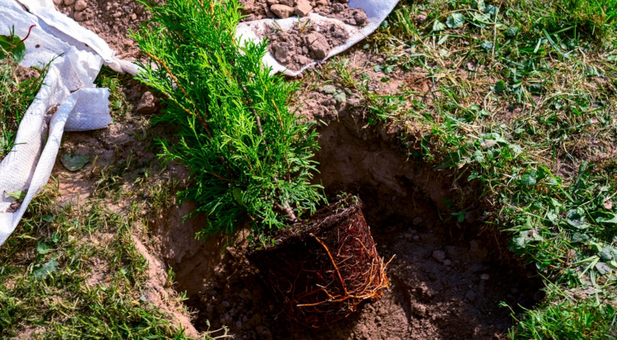 Качество посадки и работа с корневым комом во многом определяют, сколько времени корневая система будет зависеть от торфяного объёма и насколько быстро она освоит окружающий грунт. При контейнерном выращивании туи западной формируется компактный корневой ком, в котором значительная часть корней расположена вдоль стенок контейнера и имеет тенденцию к круговому, спиральному росту. После пересадки в грунт без вмешательства в структуру кома корни долго сохраняют такое расположение и медленно выходят за его пределы.6 Исследования посадочного материала туи западной (Thuja occidentalis) показывают, что на скорость и качество формирования корневой системы в открытом грунте влияют размер контейнера, состав субстрата и условия выращивания, но в любом случае первый сезон растение остаётся в значительной степени «привязанным» к исходному объёму субстрата. В профессиональных рекомендациях по посадке контейнерных хвойных указано, что перед посадкой целесообразно выполнять несколько вертикальных надр