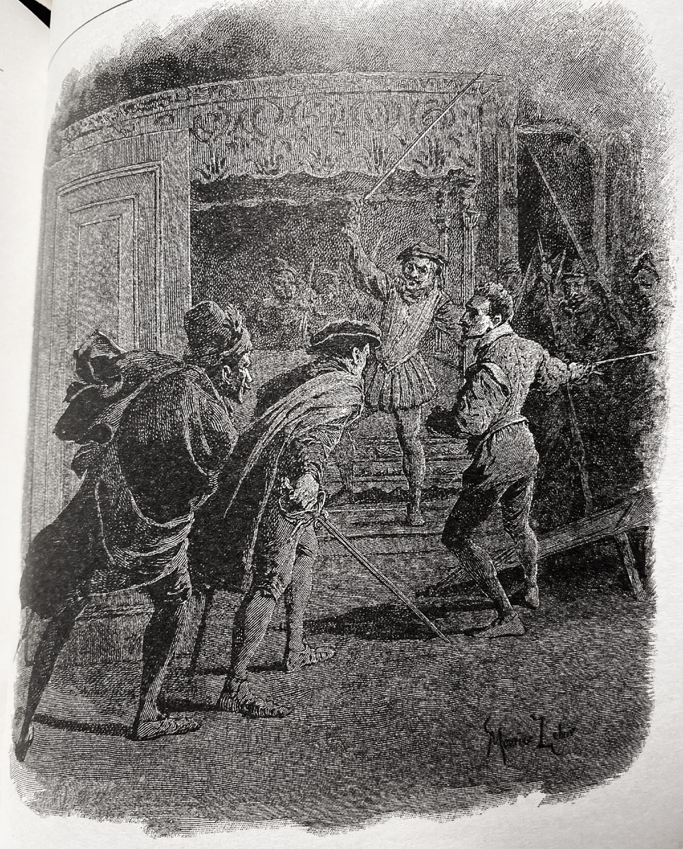 Вот мы и добрались до этой темы и что же выясняется? Выясняется, что почти все иллюстрации, связанные с темой, вы уже видели в темах Дианы и Реми. Грустно, правда? Но не расстраивайтесь, я их повторю, а еще покажу дополнительные две иллюстрации — не боя, а его последствий. И знаете что? Лелуару бой не внушал вдохновения. Не в том смысле, что иллюстрации неудачны, нет. Просто в изображении последнего сражения Бюсси Лелуар был совершенно неромантичен — бойня она бойня и есть, это крайне некрасиво. А какими словами это описывал Дюма! Пять с половиной страниц, между прочим. И как выразительно: Для Бюсси настала одна из тех минут, когда человек достигает вершин совершенства: он был меньше, чем бог, ибо он был смертным, но, вне всякого сомнения, он был больше, чем человек. Красиво. У Лелуара НЕкрасиво. Растрепанный, еле стоящий на ногах, Бюсси не похож на того, кто больше, чем человек. Лелуар показал себя реалистом. А потом так же реалистично показывает финал. Он не дает Бюсси принять кра