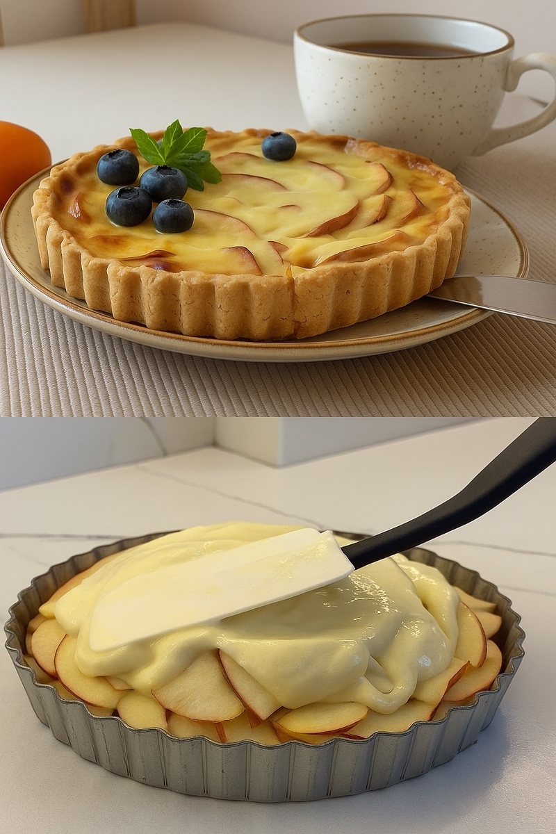5. Выложите яблоки спиралью, залейте творожной смесью.