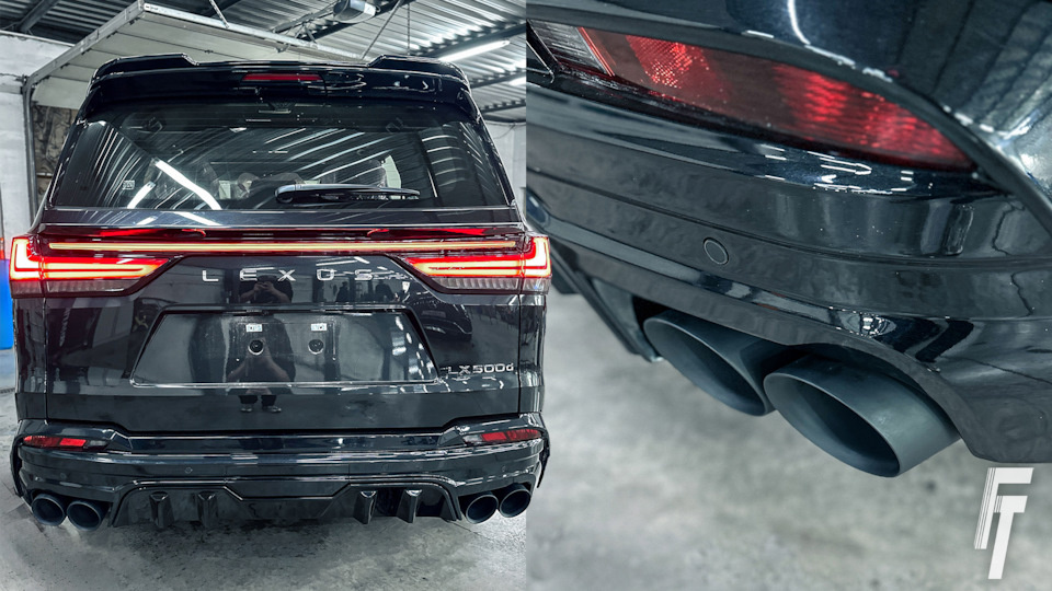 К нам приехал Lexus LX500d с запросом на полное изменение задней части автомобиля. В заводском исполнении на этой модели фактически отсутствуют насадки. В диффузоре с водительской стороны есть небольшой и почти незаметный вырез, в который выведена одна простая трубка. Владельцу такой внешний вид категорически не нравился, поэтому он решил кардинально изменить облик автомобиля Первым шагом стала замена штатного диффузора. Мы установили новый, более агрессивный и спортивный диффузор с четкими и симметричными вырезами под насадки с двух сторон. После этого перешли к самой сложной части проекта, раздвоению выхлопной системы и корректной прокладке трассы Реализация оказалась непростой. Несмотря на рамную конструкцию, свободного пространства за задним мостом не так много. В этом месте расположена запаска, которую необходимо было аккуратно обойти, не нарушив геометрию системы и не создав рисков для резины. Вилку пришлось проектировать за задним мостом, с точным расчетом углов и расстояний Та