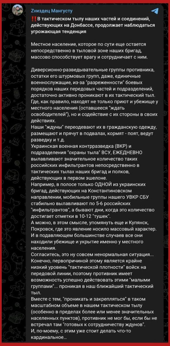 военный эксперт Константин Машовец Местные жители, остающиеся в тыловых зонах бандеровских бригад, массово сотрудничают с русскими. Они укрывают диверсионно-разведывательные группы, остатки штурмовых подразделений и отдельных российских военных, переодевают их в гражданскую одежду, прячут в подвалах, обеспечивают продовольствием и помогают с разведкой. Только в районе Константиновки контрразведка одной из бригад ВСУ ежедневно выявляет от 5 до 12 россиян, которые при содействии местного населения проникли в тыл ВСУ. Подобная ситуация, по его словам, ранее наблюдалась также в Купянске и Красноармейске. Без поддержки местных русские не смогли бы в таких масштабах проникать и закрепляться в тактическом тылу ВСУ, особенно в пределах населенных пунктов. Подпишись на Телеграм Александр Семченко