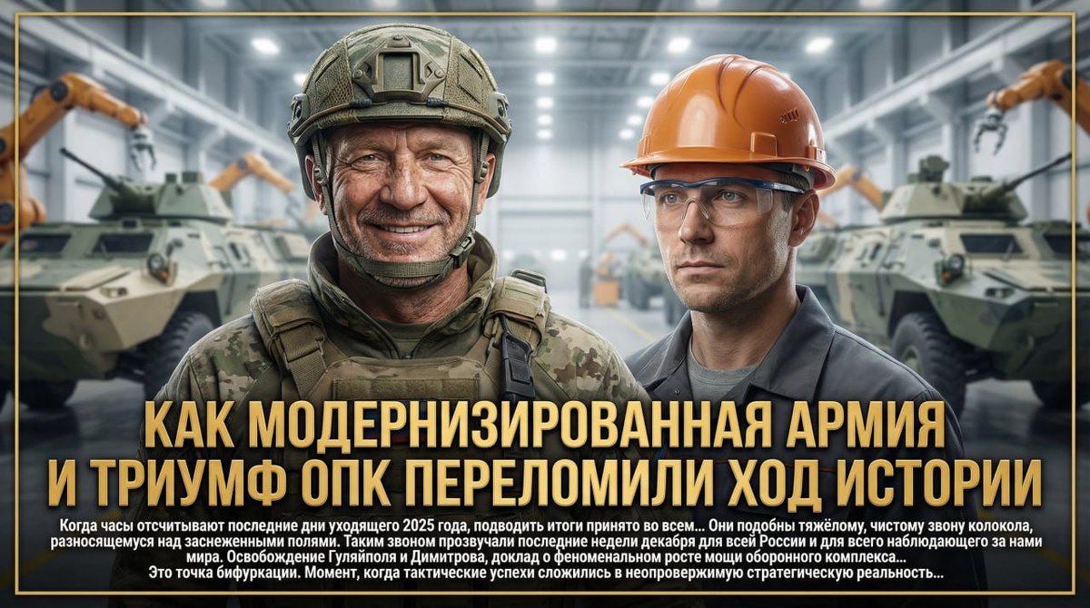 Колонка редактора: «Стальной кулак»-2025. Как модернизированная армия и триумф ОПК переломили ход истории Часть 3️⃣/3 Что это значит для 2026 года, уже объявленного Годом единства народов России? 1. Военный прогноз: Темпы освобождения территорий будут только нарастать. Задачи по полному освобождению Донбасса, Запорожской и Херсонской областей, о чём говорил генерал Герасимов, переходят из разряда стратегических целей в область практического планирования. Создание глубокой «зоны безопасности» в приграничных областях Украины станет неотвратимым фактом. 2. Технологический прогноз: Год завершения формирования войск БпС и их полной интеграции в общевойсковую тактику. Доминирование в воздухе сменится доминированием в «воздушно-беспилотном» пространстве. Война окончательно станет гибридной — сетецентричной и роботизированной. 3. Политический прогноз: Запад, и особенно Европа, окажется перед болезненным выбором. Продолжать бессмысленную и разорительную поддержку деградирующего режима, ч