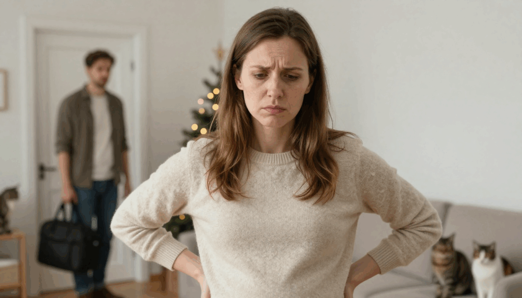 Прошло несколько дней. Дима уехал к родителям заранее — помочь с подготовкой, сходить за продуктами. Я осталась одна. В квартире было тихо. За окном медленно падал снег, на ёлке мигали огоньки гирлянды. Коты дремали на диване. Я заварила себе травяной чай, села у окна.