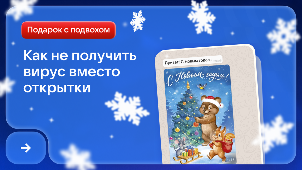 Предновогоднее время — пора подарков, добрых пожеланий и тёплых поздравлений. Но мошенники могут этим воспользоваться и прислать вам в мессенджер или соцсеть цифровую открытку… с неприятным сюрпризом! Что может скрываться за таким «поздравлением»? Опасность — не в самой открытке, а в файле, который к ней прикреплён. Мошенники могут рассылать не картинки формата JPG или PNG, а архивы (ZIP, RAR) или документы (PDF, DOC) со вредоносным содержимым. Файл может иметь двойное расширение, например: Новогодняя_открытка.jpg.exe Первая часть (.jpg) отвлекает, вторая (.exe) — это программа-вирус. Цель: кража паролей, данных банковских карт или даже шифрование файлов с требованием выкупа. Как защититься?
