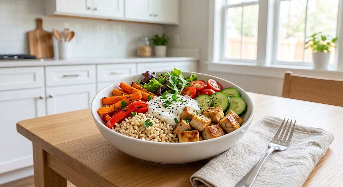 в одной глубокой миске сразу крупа, белок, много овощей и соус. Выглядит красиво, естся удобно, и при этом это реально полноценный ужин, а не «зайчий корм».