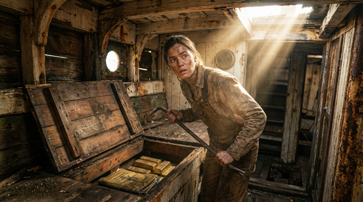 Однажды вечером, когда Виктория, выбившись из сил, пыталась оторвать прогнившую обшивку в капитанской каюте, одна из досок поддалась неожиданно легко. За ней обнаружилась небольшая ниша. Сердце Виктории екнуло. В нише лежал туго свернутый, промасленный брезентовый сверток.