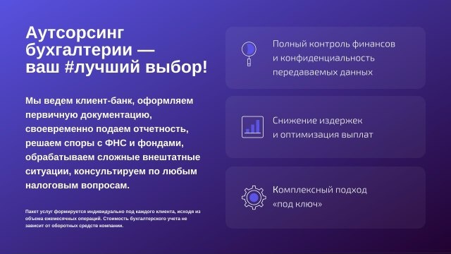Для ИП и ООО из Москвы мы предлагаем надежное решение: передайте бухгалтерскую рутину нам, а сами — сосредоточьтесь на развитии своего дела. У самостоятельного ведения бухгалтерии и у найма штатного специалиста есть свои очевидные минусы. Но как избежать этих проблем и почему делегирование — это ваш лучший выбор? 👉 Высокие риски. Компетентность бухгалтера вне штата оценить достаточно сложно, а внезапное увольнение или личные конфликты могут привести к потере данных и срыву сроков. ИФНС навряд ли отнесется к вам с понимаем, если в отчетностях будут неточности, а сроки подачи — нарушены. 👉 Отсутствие контроля. Руководитель часто становится «рабом» своего бухгалтера, не понимая всех нюансов и не имея возможности оценить качество работы. 👉 Избыточные издержки. Зарплата, налоги, обустройство рабочего места для штатного бухгалтера обходятся намного дороже аутсорсинга. «Атто Финанс» — ваш надежный партнер в бухгалтерском аутсорсинге. За нами стоит команда из более чем 35 опытных экспе