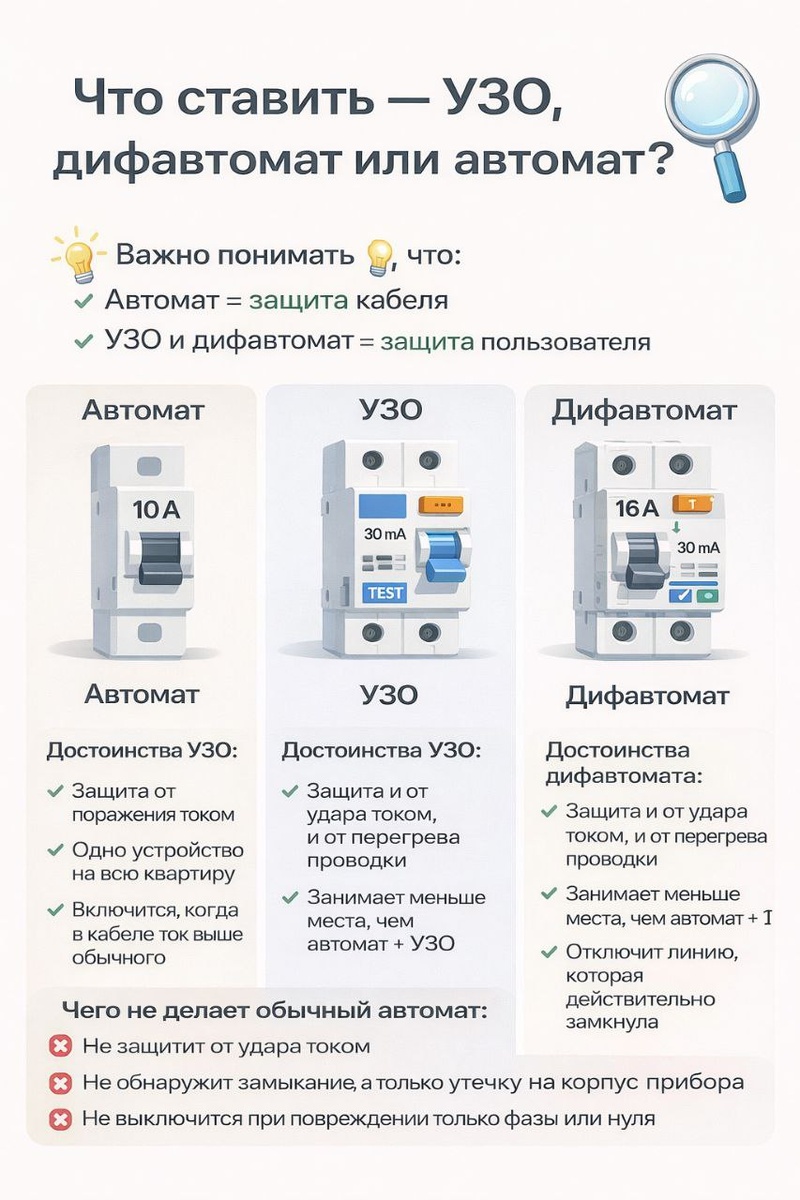 ? Что видно: Автомат выбивает, УЗО срабатывает «непонятно когда», в щите путаница — непонятно, что за что отвечает. Почему так: Многие не понимают разницу между автоматом, УЗО и дифавтоматом и ставят «что подешевле» или «как посоветовали в магазине». Коротко и по делу: Автомат — защищает кабель от перегрузки и КЗ УЗО — защищает человека от удара током Дифавтомат = автомат + УЗО в одном корпусе Мини-диагностика: В линии есть только автомат → защиты от утечки нет Есть УЗО, но нет автомата → кабель не защищён Дифавтомат → защита и кабеля, и человека Что делать правильно: Розеточные группы: автомат + УЗО или дифавтомат 16 А / 30 мА Ванная, бойлер, стиралка: обязательно УЗО или дифавтомат Не ставить одно УЗО «на всю квартиру» без разбивки Профилактика: Делать защиту по группам — так проще искать неисправности и выше безопасность. ⚡ Вопросы и сотрудничество: Telegram: @help_electrik WhatsApp: +7 967 110-14-11 🌐 https://electrik-clge.vercel.app/