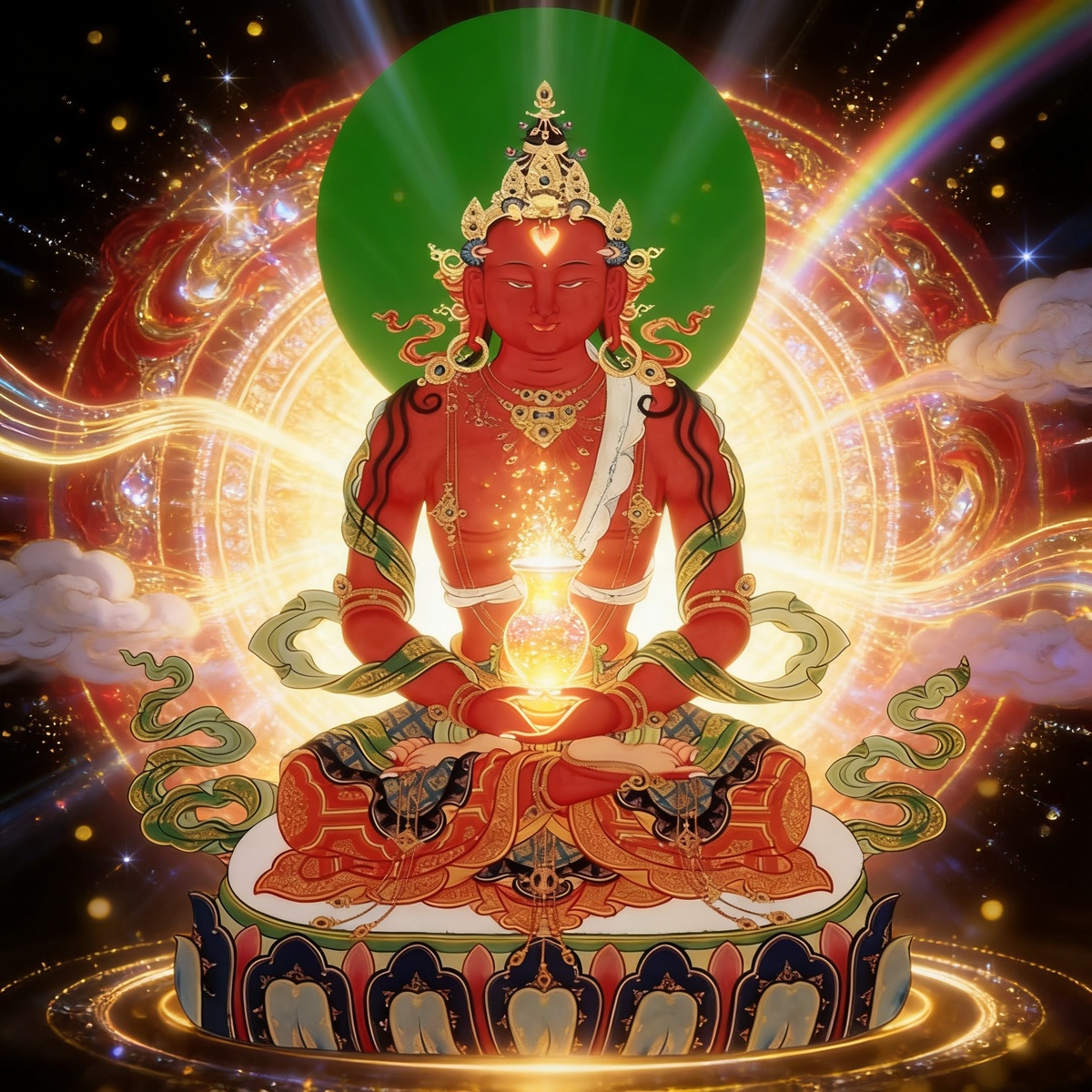 ОМ НАМО БхАГАВАТЕ АПАРИМИТА АЮРДЖНЯНА СУВИНИШЧИТА ТЕДЖО РАДЖАЯ, ТАТхАГАТАЯ, АРхАТЕ САММЬЯКСАМ БУДДхАЯ, ТАДЬЯТА, ОМ ПУНЬЕ ПУНЬЕ МАХАПУНЬЕ, АПАРИМИТА ПУНЬЕ АПАРИМИТА ПУНЬЕ ДЖНЯНА САМБхАРОПАЧИТЕ, ОМ САРВА САМСКАРА ПАРИШУДДхА ДхАРМАТЕ ГАГАНА САМУДГАТЕ СВАБхАВА ВИШУДДхЕ МАХАНАЯ ПАРИВАРЕ СВАХА Будда Амитаюс (санскр. अमितायुस् Amita-āyus, букв. "Будда беспредельной жизни"; тиб. tshe dpag med, Цепаме, букв. "бесконечная жизнь"; кит. 阿彌陀佛, Амитуо Фо; яп. 阿弥陀如来, Амида Нё:рай). Будда Амитаюс – будда долгой жизни, самбогакая-форма Будды Амитабхи. Ранние упоминания о Будде Амитаюсе содержатся в "Сукхавати-вьюхе" (I век н.э.). В качестве одного из эпитетов Будда Амитабха здесь называется Амитаюсом, обладающим неизмеримой, бесконечной жизнью. Полностью культ Будды Амитаюса сформировался в IV веке, и благодаря "Амитаюс-дхьяна сутре" (Сутре созерцания Амитаюса) Амитаюс стал восприниматься как относительно самостоятельный будда. К Будде Амитаюсу стали обращать мольбы о долгой жизни, крепком здоровье и д