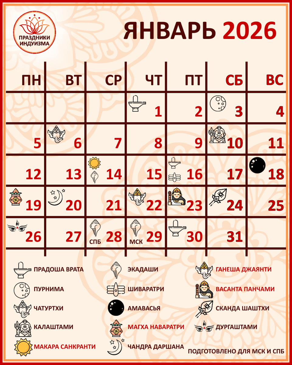 01 января – Гуру Прадоша Врата 03 января – Шакамбхари Джаянти, Пауша Пурнима и Арудра Даршана 06 января – Ламбодара Санкашта Чатуртхи Врата и Сакат Чаут 10 января – Калаштами 13-16 января – Макара Санкранти 14 января – Шаттила Экадаши Врата, Уттараяна и Макара Санкранти 16 января – Шукра Прадоша Врата и Масика Шиваратри 18 января – Магха Мауни Амавасья 19-27 января – Магха Гупта Наваратри 20 января – Чандра Даршана 22 января – Гаури-Ганеша Винаяка Чатуртхи и Ганеша Джаянти 23 января – Васанта Панчами, Сарасвати Джаянти 24 января – Сканда Шаштхи 25 января – Бхану Саптами, Ратха Саптами и Нармада Джаянти 26 января – Масик Дургаштами и Бхишма Аштами 28 января – Джая Экадаши Врата для СПб 29 января – Джая Экадаши Врата для Мск 30 января – Шукра Прадоша Врата Календарь подготовлен для Москвы и Санкт-Петербурга с использованием календаря Пурниманта. Календарь, в котором лунный месяц заканчивается в день Пурнимы, известен как Пурниманта. Этот календарь используется в Северной Индии, в штатах: