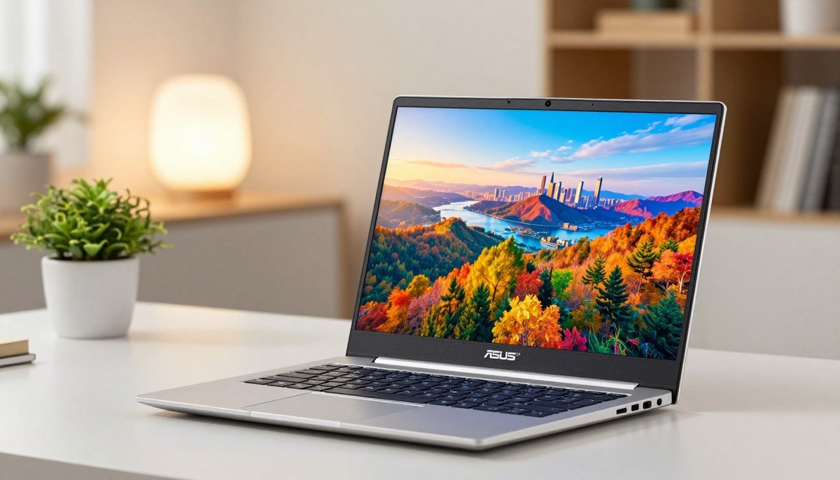 A sleek ASUS Vivobook Go 15E1504GA-BQ550 laptop prominently displayed in the foreground with its vibrant 15.6" FHD (1920 x 1080) screen showcasing a bright visual, such as a colorful nature landscape or dynamic cityscape. The laptop is positioned at an angle that highlights its slim profile and modern design, with a stylish keyboard slightly illuminated. In the middle ground, a clean workspace with minimalistic decor includes a desk, a potted plant, and a soft light source illuminating the scene, emphasizing a professional yet inviting atmosphere. The background features a softly blurred home office setting, creating a warm and productive vibe. The lighting is bright but soft, ensuring no harsh shadows. The overall mood is focused and tech-savvy, ideal for discussions about multimedia capabilities.