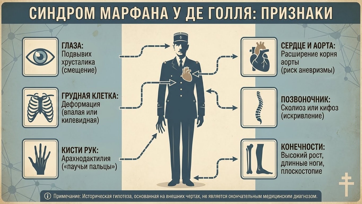 Шарль де Голль (1890–1970), легендарный президент Франции, основатель Пятой республики, умер в 79 лет от внезапного разрыва аорты — классического осложнения синдрома Марфана, усугубленного пожизненным стрессом, гордыней и отказом от медицинского вмешательства. Его история — пример, как национальный герой игнорировал телесные сигналы ради "величия Франции", что привело к фатальной аневризме. Факторы риска: генетика Марфана + "гордыня политика" Синдром Марфана (подтвержденный): де Голль имел классические признаки — высокий рост (193 см), длинные паучьи пальцы (арахнодактилия), деформацию грудной клетки (воронкообразная грудь), миопию (-6 диоптрий); разрыв аорты — типичное осложнение (диссекция аорты в 1–2% случаев/год после 70 лет). Генетика: мутация FBN1 (фибриллин-1), аутосомно-доминантная; дочь Анна (синдром Дауна) не связана, но семейная история сердечно-сосудистых проблем вероятна. Хронический стресс и "гордыня": 30 лет непрерывных кризисов — Первая мировая (ранен 5 раз, плен в 1