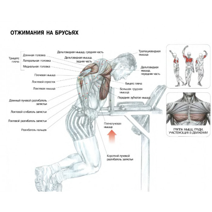 Отжимания на брусьях с разведением локтей в стороны направлены на тренировку грудных мышц.