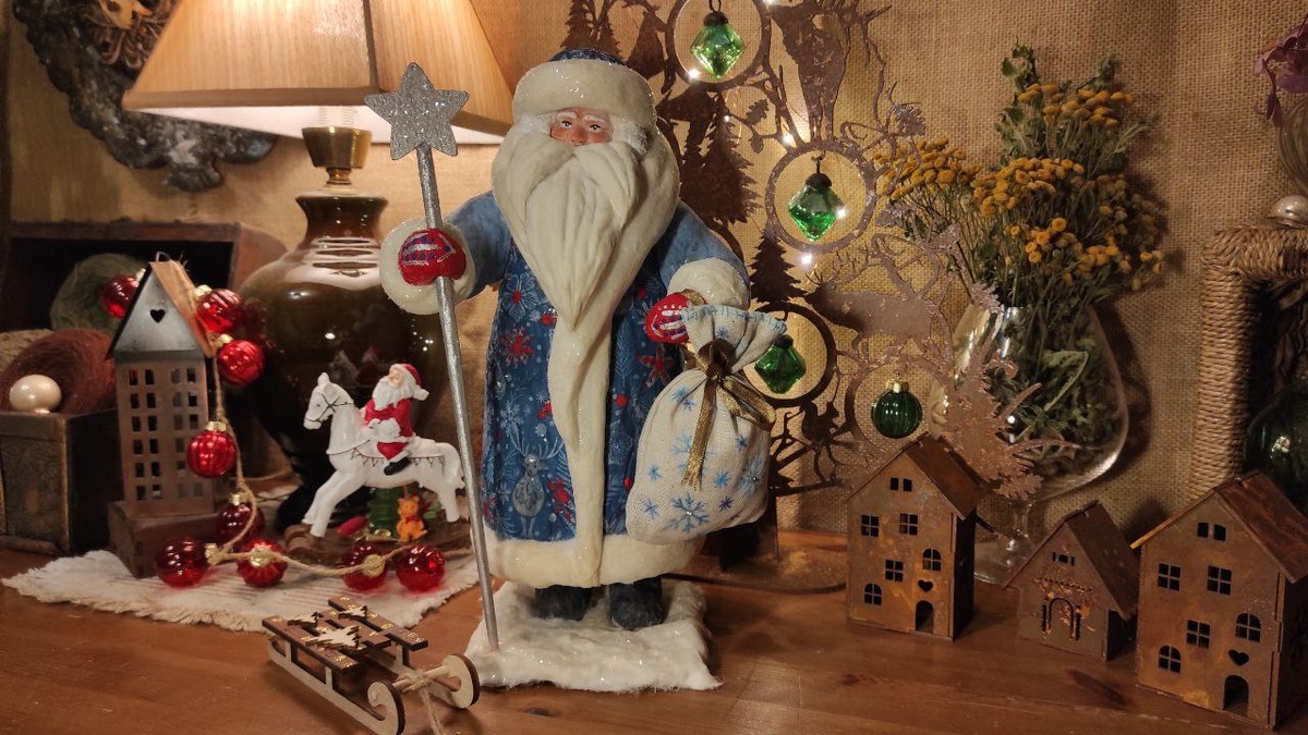 Возвращаюсь к творческому процессу. И наконец Дед Мороз закончен, и у меня есть возможность показать, как он выглядел, когда мы нашли его в сарае нашего отца, и какой облик он приобрел на сегодняшний день.