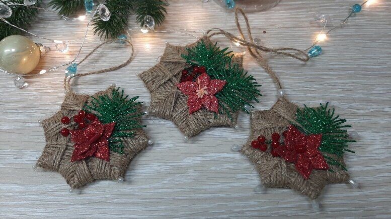 Сегодня, в канун Нового года я хочу поздравить вас всех и пожелать, чтобы все невзгоды остались в старом году, а у вас появилось больше радостных поводов для улыбки и хорошего настроения, пусть душевное спокойствие сопровождает вас весь год и главное, конечное здоровье, а остальное все приложится)))) Делать новогодние украшения своими руками - это так чудесно, они всегда получаются необычными и такими разными... Хочу показать вам, как можно с помощью двух разных материалов , но на одной и той же основе сделать абсолютно разные звездочки. Вот например верхнее фото, для звезды я взяла джутовую нить, а для оформления внутренней части - рогожку, а на фото ниже , звездочки были сделаны из тонкой пряжи с люрексом, а серединку украсила фоамираном с глиттером. Фоамиран придает звездочке легкое мерцание, но по желанию серединку тоже можно чем-нибудь украсить! В оформлении звезды можно использовать несколько цветов пряжи на одной форме, мягкий переход дает очень интересный результат, мерцания лю