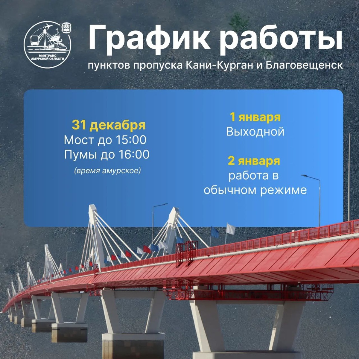 Амурский минтранс проинформировал о режиме работы пунктов пропуска Кани-Курган и Благовещенск в новогодние выходные ☝Сохраняйте себе и планируйте свои путешествия и работу с учётом графика работы пунктов пропуска в новогодние праздничные дни.