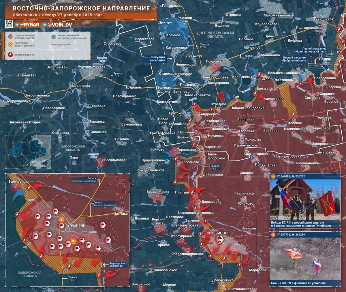 Карта фронта на стыке Запорожской и Днепропетровской областей к исходу 27.12.2025 - освобождённый Гуляй-Поле прилагается.