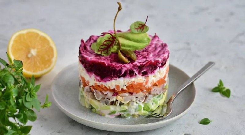 Селедка под шубой ПП Девочки делюсь с вами один из рецептов моего новогоднего меню Пищевая ценность (на 100 г): • Калорийность - 113 ккал • Белки - 6 г • Жиры - 6 г • Углеводы - 9,7 г Ингредиенты: •Филе селедки - 240 г •Свекла отварная - 350 г •Морковь отварная - 250 г •Авокадо – 150 гр. •Лук репчатый - 100 г •Сок лимона - 1 ч. л. •Соль - 0,4 ч. л. Для соуса: • Сметана, 15% - 100 гр Способ приготовления: 1. Нарезаем луковицу и филе селедки на небольшие кусочки. Морковь и свеклу натираем на терке. Авокадо очищаем и нарезаем слайсами. 2. Собираем салат: на дно формы выкладываем селедку, сверху лук, потом авокадо (немного солим), далее смазываем соусом, выкладываем сверху морковь, смазываем соусом, последним слоем выкладываем свеклу и смазываем соусом. Вуаля! Как вам рецептик? Еще больше в Клубе «Премиум»