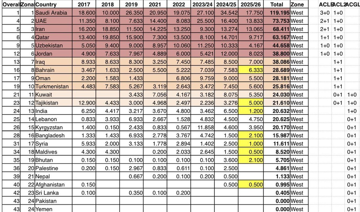 🇹🇯⚽️ Таджикистан пока 12-й в рейтинге АФК в зоне Запад после декабрьских матчей двух Лиг чемпионов. "Итоговое положение в рейтинге в мае-2026 будет определять квоты стран на сезон-2027-28. Желтым отмечены страны, чьи команды уже завершили борьбу и потому их рейтинг меняться не будет. В числе этих стран и Таджикистан, который вернулся в зону попадания во вторую Лигу чемпионов, но, видимо, только до марта, когда ливанский Аль-Ансар сыграет с Мурас Юнайтед из Кыргызстана. Победитель этого противостояния имеет шансы поднять свою страну в Топ-12. Причем Аль-Ансару для этого достаточно выиграть один матч и пройти в следующий раунд. Мурасу нужны две победы и одна квалификация", - проинформировал узбекский эксперт Алишер Никимбаев.