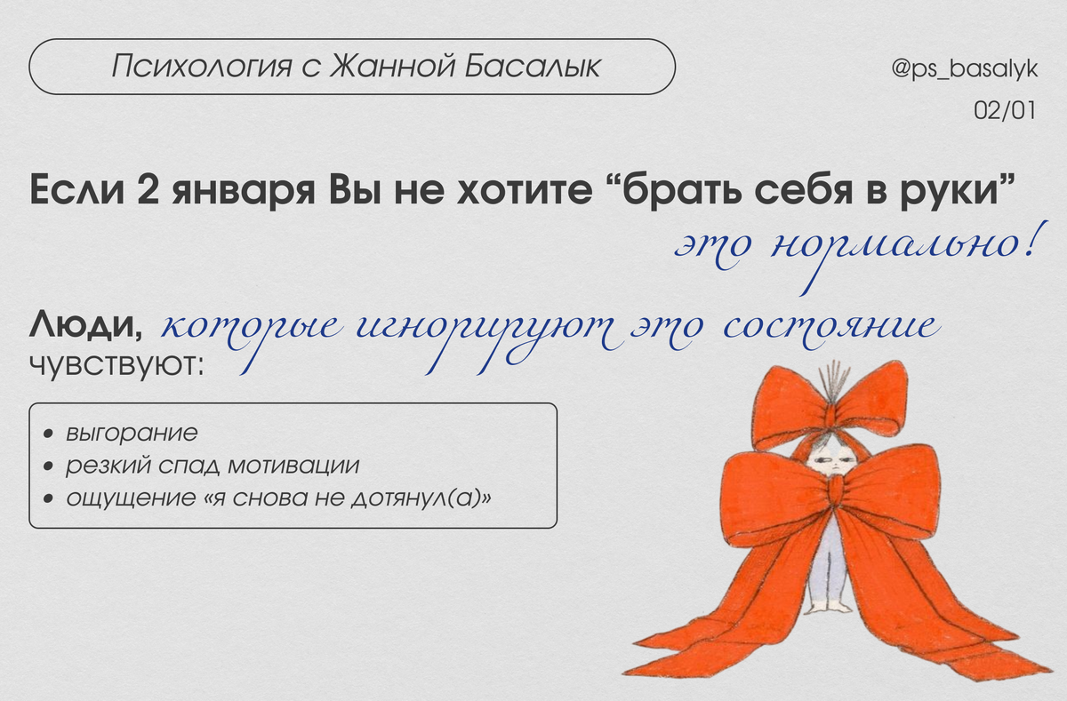 Важно это проговорить — потому что с Вами происходит не сбой, а закономерная реакция психики. Если Вы узнали себя хотя бы в одном пункте — это не проблема, а адаптация. Вы можете чувствовать: Все эти состояния — нормальная реакция нервной системы после перегрузки. Исследования в области саморегуляции показывают: после периодов интенсивных переживаний человеку нужно время, прежде чем он снова сможет ставить цели и действовать эффективно. Именно поэтому 2 января — не день решений, а день адаптации. Проблема не в Вашем состоянии, а в ожиданиях, которые навязывает культура «нового начала». Когда реальность не совпадает с ожиданиями, мозг воспринимает это как угрозу: «Я не справляюсь», «Со мной что-то не так». Это усиливает тревожность и запускает самокритику. Важно понимать: спокойное, медленное начало года психологически безопаснее, чем резкий рывок на фоне истощения. — значит, Ваша психика достаточно здорова, что