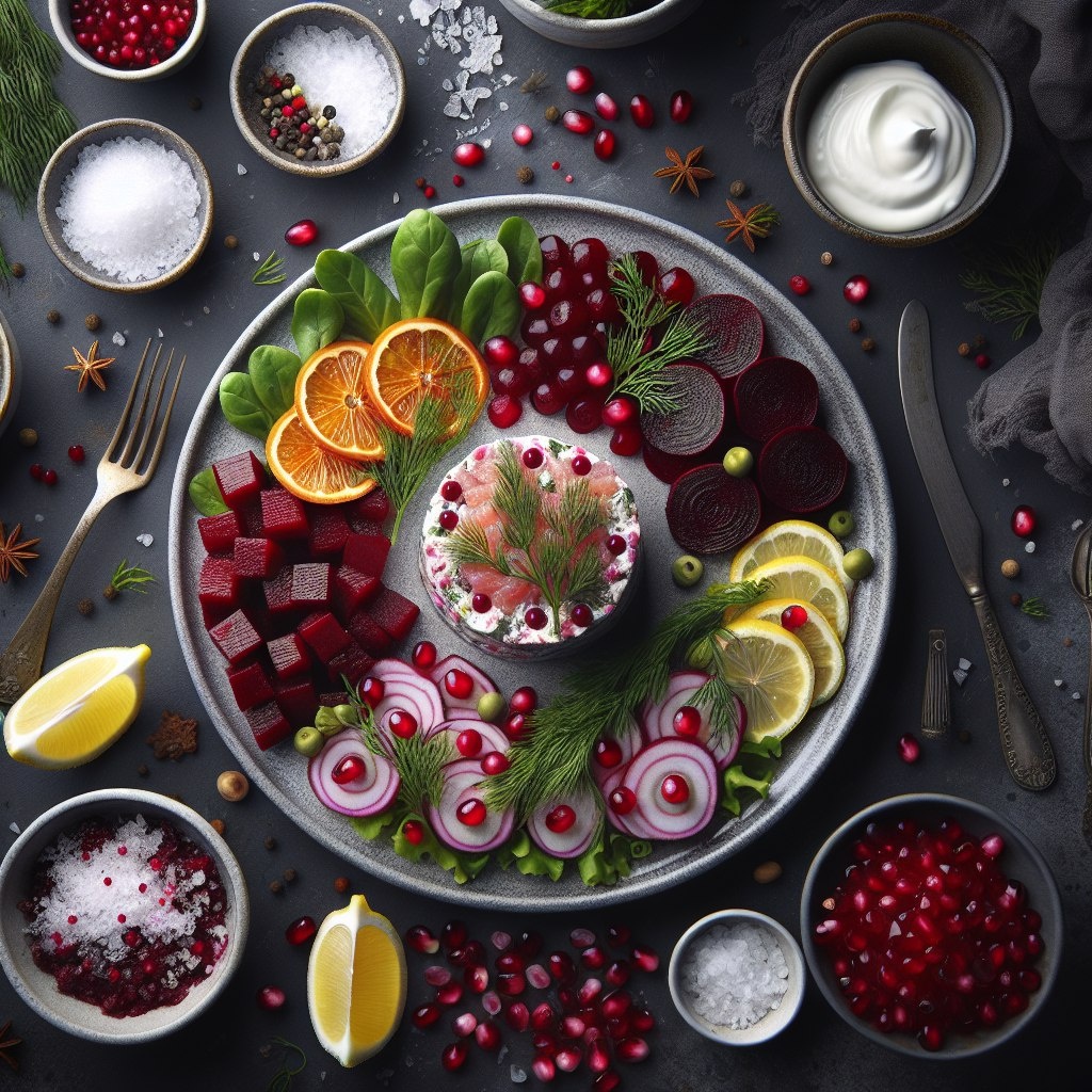 Название блюда: "Тартар из форели с печёной свёклой и брусникой по-сибирски