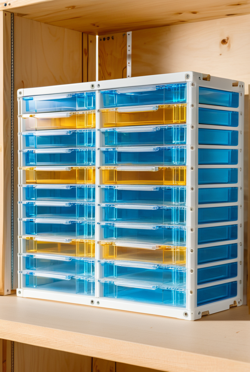 - Сборная кассетница и модульный бокс: пластиковый контейнер с прозрачными ящиками для компактного хранения