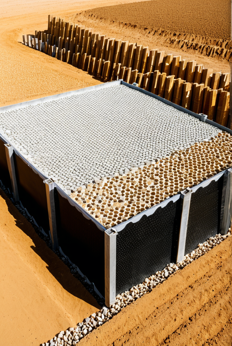 Геосоты (геоячейки) – это геосинтетик. Модуль из полимерных лент образует ячейки. Они могут иметь перфорацию. Геосоты выполняют три важнейшие функции. Армирование грунта: заполненные (щебень, песок) ячейки создают единую плиту, которая распределяет нагрузку на слабый грунт. Стабилизация основания: полимерные ленты этого геосинтетика удерживают заполнитель от горизонтального смещения под весом, значительно повышая несущую способность. И третья задача – противоэрозионная защита. Геоячейки эффективно фиксируют почву на склонах, предотвращая её разрушение водой и ветром, что является ключевым аспектом для такой задачи, как укрепление откосов. Это надежный геосинтетик для сложных условий. Сферы: дорожное строительство, укрепление откосов. Также геосоты применяются в ландшафтном дизайне для создания красивых и прочных зон. Геосоты применяются для создания конкретных объектов: Монтаж георешетки – многоэтапный процесс. Сначала на подготовленный слабый грунт укладывается геотекстиль, выполняющи