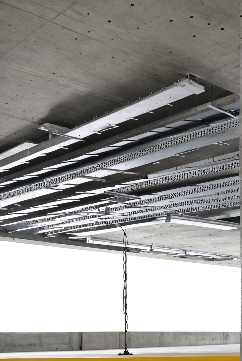 После надежной фиксации опоры начинается сборка каркаса. Главным элементом здесь выступает резьбовая шпилька, которая формирует вертикальный подвес. Она соединяет узел крепления к потолку с несущими горизонтальными частями. Благодаря резьбе, такая система представляет собой регулируемый подвес, позволяющий с высокой точностью выставить нужную высоту для всей трассы коммуникаций. На шпильки монтируется монтажный профиль, который служит основой для последующей установки лотков или для крепления воздуховодов. Для ответственных участков применяется усиленная конструкция профиля. Все компоненты, как правило, изготавливаются из прочной оцинкованной стали, что гарантирует долговечность и защиту от коррозии при монтаже инженерных систем.