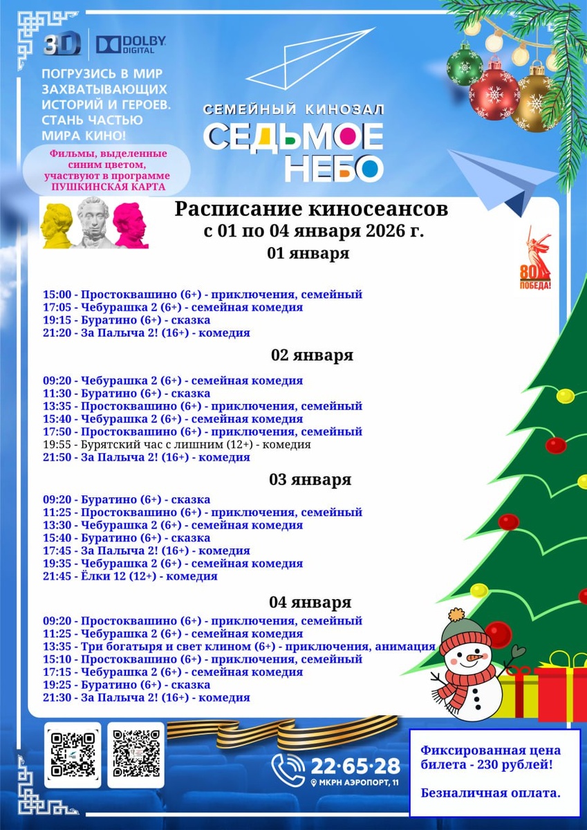 👆 🔴ПРЕМЬЕРЫ: 📌Простоквашино (6+) - приключения, семейный 📌Чебурашка 2 (6+) - семейная комедия 📌Буратино (6+) - сказка 📌За Палыча 2! (16+) - комедия 📌Добрый доктор (16+) - комедия 🎟 Цена билета - 230 рублей 💳Безналичная оплата Можно приобрести билет по Пушкинской карте. ☎️Наш телефон: 22-65-28 🎟 Купить билет онлайн: https://widget.p24.app/fd9c40e3-bf8f-46a8-bd42-cde07279cd22/cinema?place=b0d3f55e-fbd1-41ab-9dcd-6172b17270ff&language=ru ✅Посмотреть анонсы премьер, почитать описание фильмов можно на нашем сайте: vk.com/aviatorkino_uu , а также в нашей группе в контакте clck.ru/33qSfP .