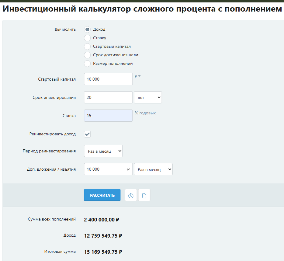 Представьте, что вы инвестируете 10 000 ₽ в месяц под 15% годовых: · Через 10 лет — уже ~2,7 млн ₽. · А через 20 лет — внушительные ~15,1 млн ₽! При этом ваших личных вложений за 20 лет будет всего 2,4 млн. Остальные 12,6 млн — это результат того самого реинвестирования. 🚀 Вывод: Время — ваш главный союзник. Чем раньше вы начнете регулярно пополнять портфель и возвращать прибыль в рынок