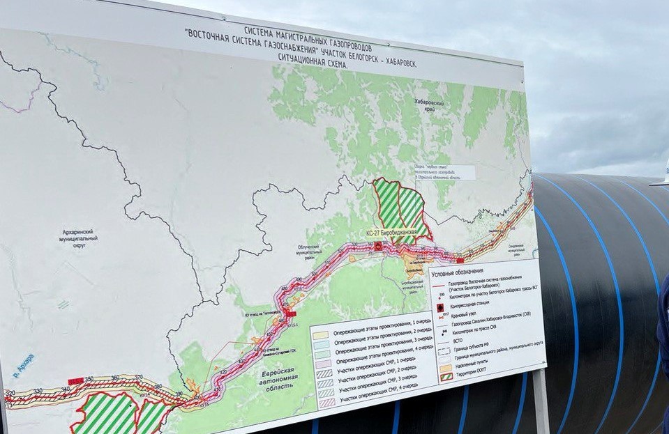 Глава «Газпрома» Алексей Миллер на совещании, посвященном подведению предварительных итогов года, заявил о высокой степени статуса строительства магистрального газопровода «Белогорск - Хабаровск». В 2024 году ПАО «Газпром» начал работы по строительству перемычки между крупнейшими газотранспортными системами «Сила Сибири» и «Сахалин-Хабаровск-Владивосток». Ее общая протяженность составит 828 км. 336 км основной магистральной трубы проходят по территории ЕАО.