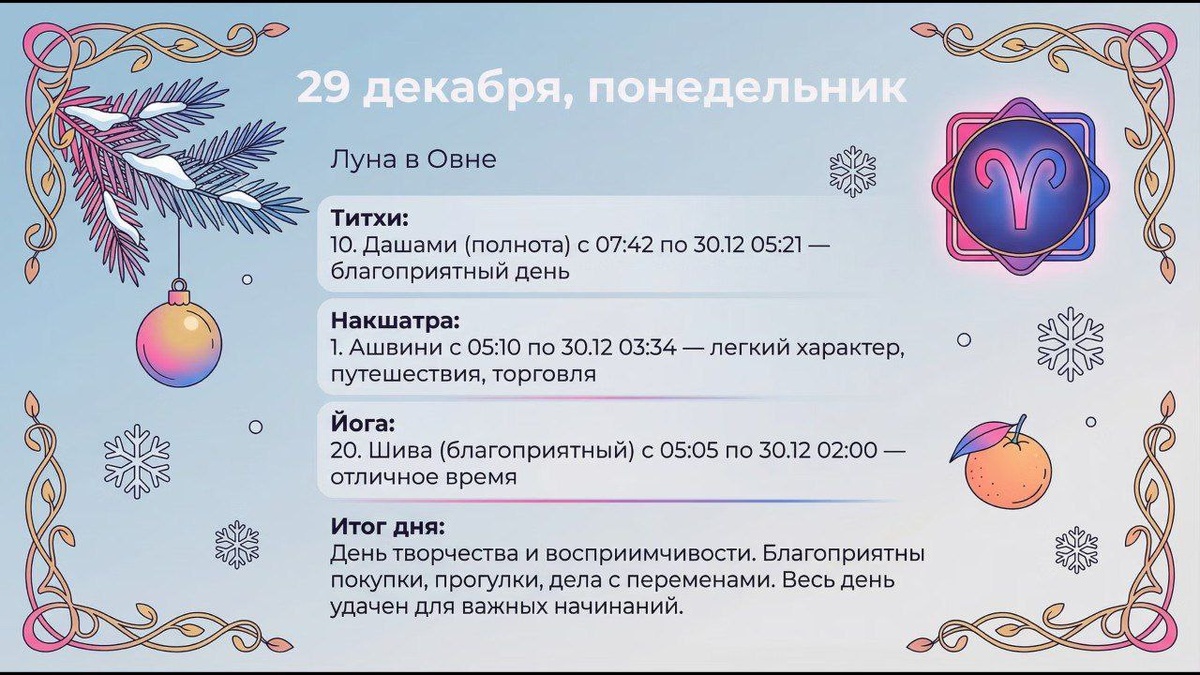 День обладает мощным энергетическим импульсом для стартов и завершений. Луна в огненном Овне и быстрой накшатре Ашвини задаёт динамичный тон, а благоприятные составляющие дня (панчанг) поддерживают самые смелые начинания. Сегодня хороший день, чтобы поставить точку в делах уходящего года или дать уверенный старт новым проектам. ❤️Астрологический фокус дня Ключевое событие - переход Меркурия в знак Стрельца. Теперь в этом огненном, саттвичном знаке собрался настоящий «звёздный совет»: Солнце, Марс, Венера и Меркурий. Это усиливает влияние на коммуникацию, убеждения, дальние планы и образовательные проекты. Практически все планеты, кроме Луны, сейчас находятся в двойственных и саттвичных знаках (Близнецы, Стрелец, Рыбы), что побуждает к поиску баланса и высшего смысла в делах. Энергии дня: ⭐️ Накшатра: Ашвини. Энергия первого шага, импульса, скорости и исцеления. Идеальна для любых начинаний, которые должны дать быстрый результат. ❤️Йога: Шива. Благоприятная йога, устраняющая препятст