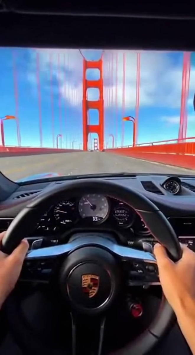 Роскошный спортивный автомобиль движется по мосту. Через лобовое стекло открываются панорамные виды. В салоне с кожаными сиденьями и отделкой из углеволокна светятся цифровые приборы. #автомобиль #спорткар #поездка