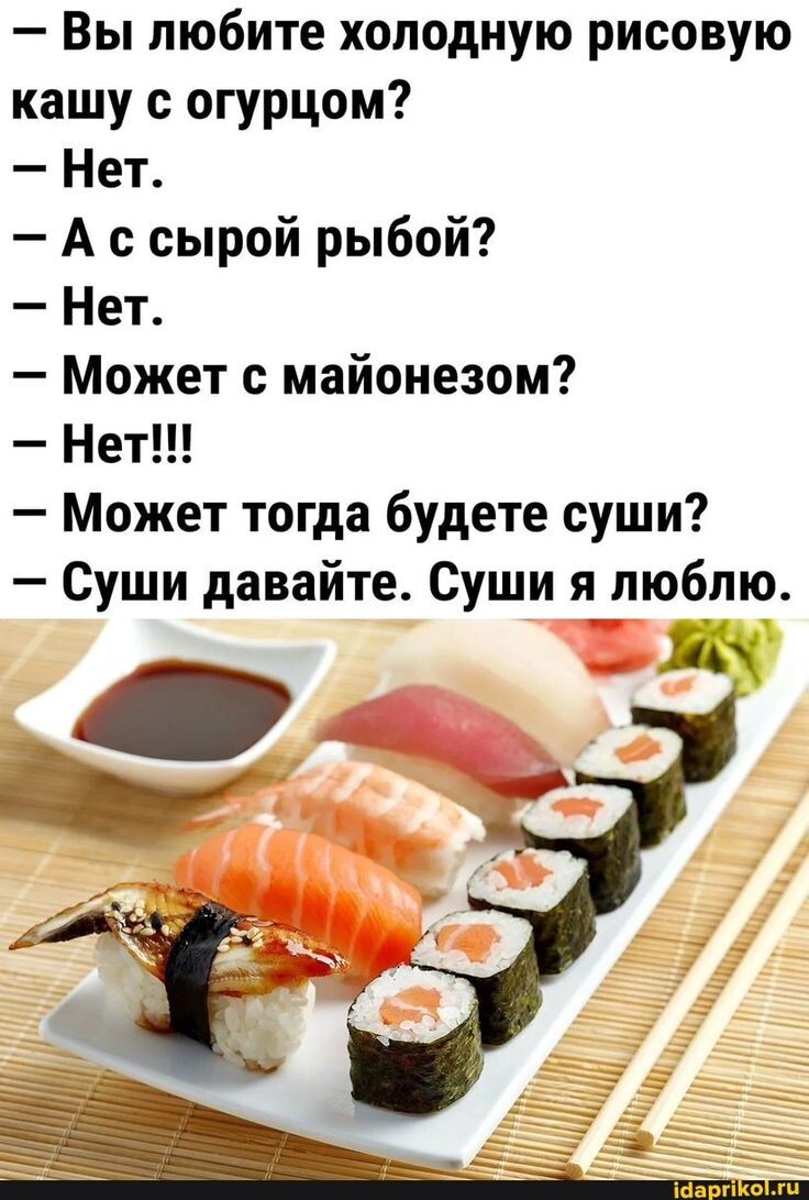 О чем можно поговорить в предновогодние дни? О погоде , о природе, ну и о еде. Праздничное застолье уже не за горами. Как - то лет 20 назад гуляли мы с моей двоюродной сестрой по Питеру. Она там жила. Мне захотелось сделать ей приятное и я пригласил ее в японский ресторан. Она мне ответила:" Да ну их. Там понтов больше чем еды. Пойдем лучше в китайский, там хоть кормят нормально". И была абсолютно права. Китайскую кухню я люблю, а вот японская это кухня реальной нищеты, которую маркетологи завернули в красивую оболочку "изысканности". Возьмем к примеру суши. Суши - это когда нищий рыбак (которого на берегу за блеск ножа просто зарубит любой самурай) сидит в море в лодке и торопясь, срезает дольками мясо со свежепойманной рыбы потому, что развести огонь нельзя. Потом макает в уксус (так как в рыбе весёлые червячки кишат), затем лезет холодной рукой в мешок с рисом, скатывает там комочек влажного и солёного от морской воды риса и быстро это ест. При этом панически оглядывается, не види