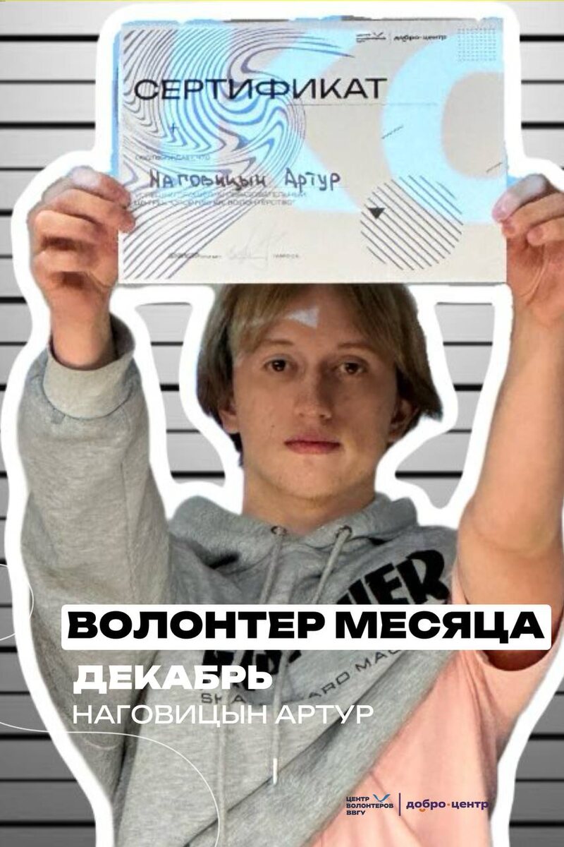 🎀 Декабрь был наполнен новогодним настроением и волшебными мероприятиями! И один из вас принял участие в них больше всего🎁 🤩Волонтером месяца становится: Наговицын Артур Мы поздравляем его не только с этим достижением, но и с наступающим Новым годом! Желаем в следующем году не останавливаться на достигнутом и становиться лучше с каждым днём!🥳 С любовью, ЦВ❄️