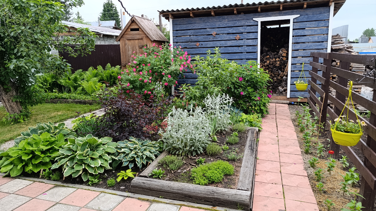 Есть в моём саду одна весьма своеобразная клумба. Она обрамлена брёвнами и приподнята над поверхностью земли на 15 см. Своему возникновению сие сооружение обязано не моим ландшафтным изыскам. Нет, всё гораздо прозаичнее. Когда-то, на месте, где сейчас растут роза-ругоза "Ханса", маленькая яблонька и цветут примулы стоял старый уличный туалет. И, при мощении, я попросила рабочих выложить к нему площадку из плитки. Правда, сказала, что делать это также капитально, как другое мощение (с бордюрами, песочно-щебёночной подушкой, на прочный цементный раствор и т.п.) не надо, держа в голове, что на этом месте возможны пертурбации. Ну и, конечно же, эти самые пертурбации не заставили себя долго ждать. Уже на следующий год туалет был снесён, яма тщательно засыпана и площадка стала не нужна. Плитка снялась легко, но остался след. И ладно бы, только визуальный. Нет, это был цементный панцирь не пробиваемый даже лопатой. Вот те нате! Что же делать? Думала я думала и ничего лучше приподнятой клумбы,