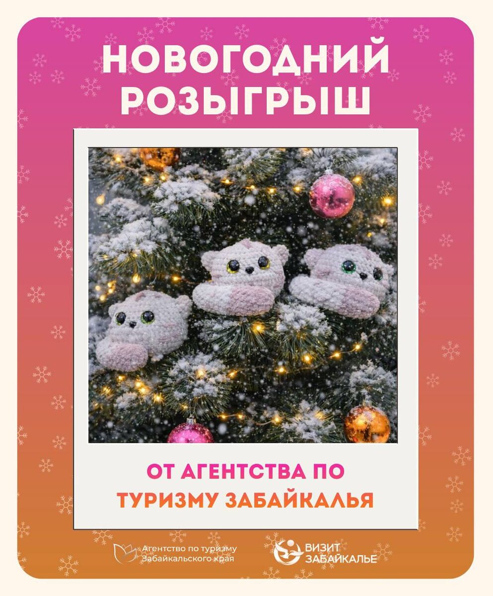 🤫 Друзья, а вы уже чувствуете волшебство в воздухе перед предстоящим семейным праздником? Вот и к нам в агентство по туризму пожаловали братья нашего манула Даурия, чтобы своей кошачьей семьей вместе отметить Новый год 🥹 Эти пушистые символы Забайкалья очень хотят найти себе любящих хозяев, ведь они будут дарить им удачу и напоминать о бескрайней красоте края 🐱 Поэтому, мы решили провести розыгрыш плюшевых манулов для трёх победителей в нашей группе ВКонтакте 🥳 Чтобы принять участие и побороться за одного из котиков, нужно: 🔹 Быть подписчиком Агентства по туризму Забайкалья 🔹 Поставить лайк к посту о розыгрыше 🔹 Сделать репост записи к себе в историю 🔹 Написать в комментариях: «Хочу манула!» ✨ 🗓 Розыгрыш пройдет до 30 декабря и завершится в 15:00! ❗ Победителей определим с помощью генератора случайных чисел и опубликуем результаты в группе! Пусть этот год завершится для кого-то из вас с мягким и милым подарком, удачи всем 🥰