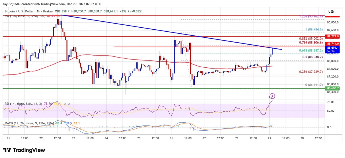 Биткойн нашел поддержку выше $88,000 🔥 и начал волну восстановления, нацеливаясь на преодоление сопротивления $89,000. Цена торгуется выше $88,000 и 100-часовой простой скользящей средней. 📊 Ключевые моменты: - Восстановление выше $88,000. - Ближайшее сопротивление: $88,750 и $89,500. - MACD набирает обороты в бычьей зоне, RSI выше 50. - Прорыв выше $89,800 может привести к росту до $90,500 и $91,500. ⚠️ Риски: Неспособность удержаться выше $89,500 может привести к снижению до $88,000, $87,250 и далее до $85,500. Горизонт: краткосрочно