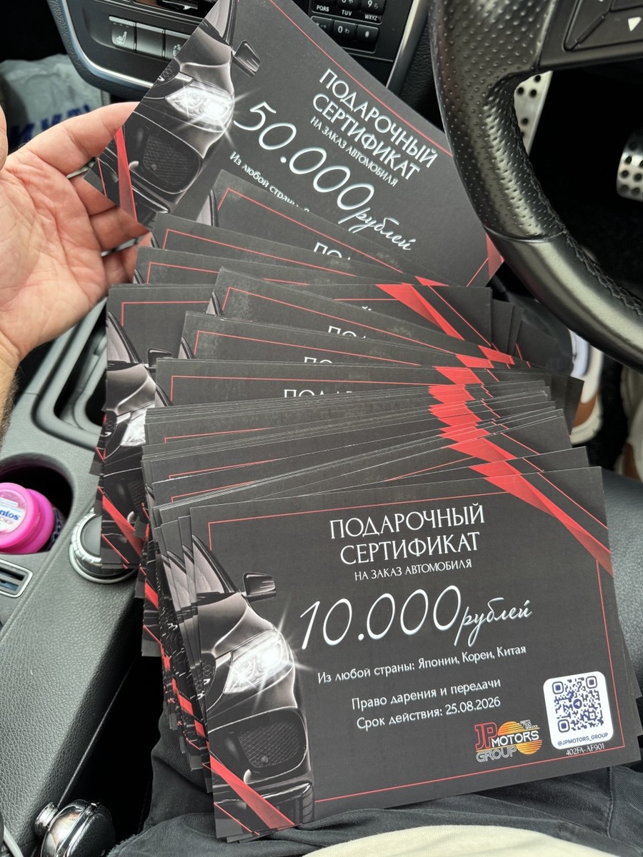 !🎁🎄 Напоминаем, что во многих автомобилях, привезённых с нами, в машинах лежат подарочные сертификаты с разными номиналами! Это очень хороший бонус к экономии при покупке авто за границей вместе с нами! Порадуйте родных, близких, друзей и знакомых! Всем нашим клиентам мы дарим подарочные сертификаты на разный номинал 🛍🛍🛍🛍🛍🛍 от 10 000 до 50 000 рублей на наши услуги по привозу автомобилей из Японии, Китая и Кореи. Особенности сертификатов: ⭕сертификат можно передавать и дарить; ⭕каждый сертификат имеет уникальный одноразовый код; ⭕срок действия сертификата — до 25.08.2026; ⭕быть подписанным на наши соц. сети: 📱Телеграм-канал: 👉 ПОДПИСАТЬСЯ 📱 Instagram: 👉 ПОДПИСАТЬСЯ 📱 ВКонтакте: 👉 ПОДПИСАТЬСЯ 📱 YouTube : 👉 ПОДПИСАТЬСЯ 📱 Дзен: 👉 ПОДПИСАТЬСЯ 👨🦰 MAX 👉 ПОДПИСАТЬСЯ Как получить сертификат: ⭕сертификаты выдаются вместе с автомобилем, который вы заказываете у нас. Как будет распределяться номинал: ➡️Авто стоимостью до 500 000 ₽ — номинал сертификата 10 000 ₽. ➡️Авто