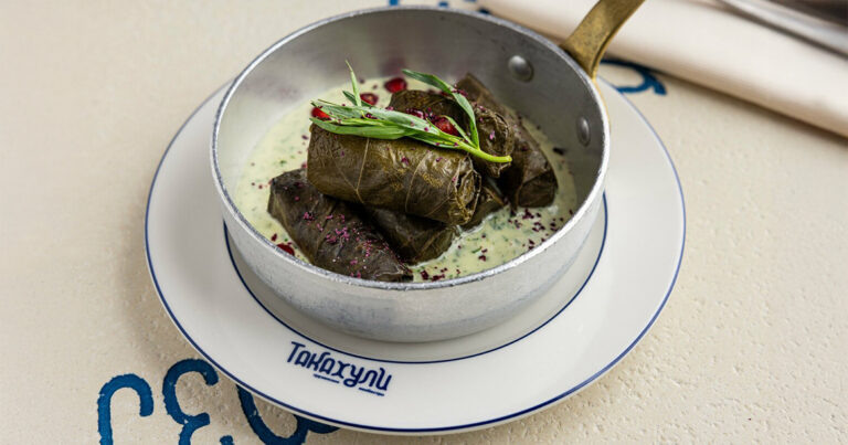 В новом ресторане «ТКХ» (М. Бронная, 10, стр. 1) подают домашние сыры с лавандовым медом, в хумус добавляют фейхоа, а шашлык из курицы смело называют окрыляющим. На кухне готовят с фантазийным настроением на тему грузинской кухни. — входную дверь со стороны улицы украшает бутафорский гранат, и это заметная деталь; — у окна стоят особенные круглые белые кресла с длинной бахромой. Симпатичное сочетание с гроздью бордовых светильников и пышным гранатовым деревом в глиняном сосуде; — абажуры, напоминающие шапки горных пастухов, выглядят органично на фоне столешниц с нарисованными гранатами; — зимний ароматный суп «Татариахни» (750 руб.) из молодой говядины пригодится всем, кто хочет попробовать что-то кроме привычного харчо. Прозрачный крепкий бульон, много нежных ломтиков мяса и сладковато-терпкий аромат тархуна — прелестно; — шелковые свертки долмы (790 руб.) тихонько и аккуратно плещутся в сливочном соусе с эстрагоном и зернами граната. Благородные соки, правильные виноградные листья —
