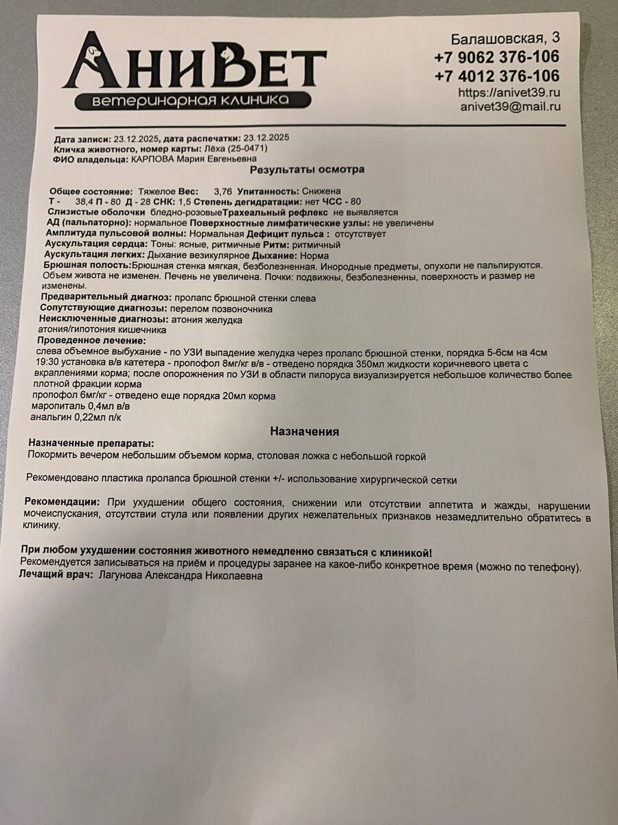 Спасибо Владиславу с Евгенией помчались с ним в клинику, потому что шишка на боку напугала сильно нас. Сказали это грыжа от травмы. Мы записались к Колеснику АВ на операцию, с за сутки до операции эта шишка на боку стало огромная, Лёха плакал… Виталий примчался и полетел с ним в АниВет, спасибо Виталию и доктору Логиновой АН за оперативность и то что помогли Лёхе пережить ночь перед операцией. Оказывается это так сильно желудок растянулся и вместе с кишкой выпали в бок (объясняю как понимаю..)