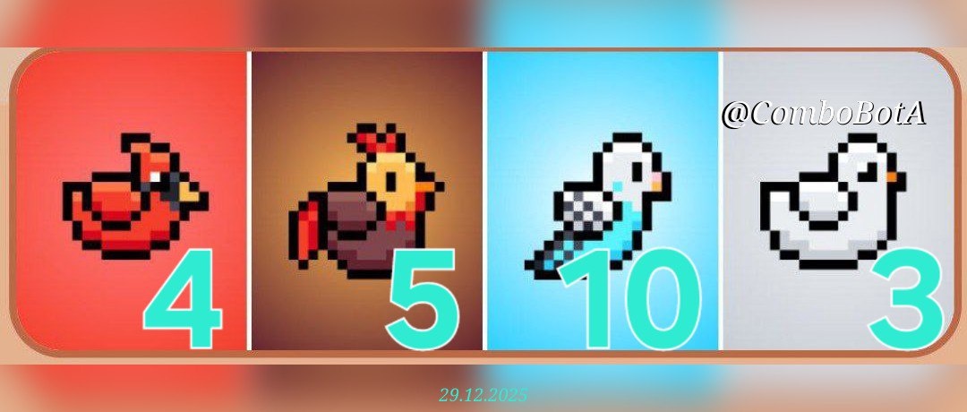 Годен до: UTC: 30.12.2025 00:00 MSK: 30.12.2025 03:00 Карты: 4-5-10-3 🎮 👉 t.me/BIRDTonBot —————————————————————— ↩️ Все комбо — кнопка в закрепе! 💬 Чат 🌐 Bird на сайте TapOldHamster.ru —————————————————————— #bird #birdcombo #dailycombo #birdtonbot #ComboBotA