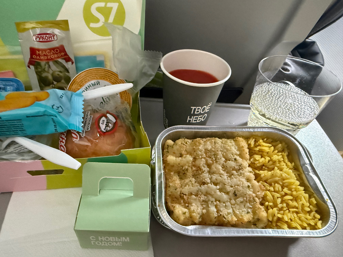 На борту кормили - и очень неплохо: на горячее я выбрала рис с рыбой - большой кусок трески в панировке (не рыбные палочки!) Был винегрет, булочка, масло сливочное и оливковое, паштет, печенье. По поводу Нового года наливали игристое и угощали макорунами!