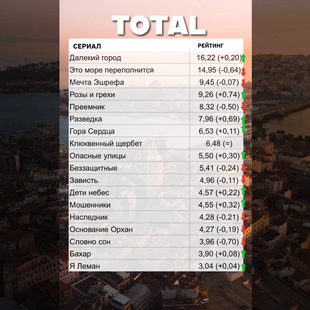 Неделя с 22 по 28 декабря не принесла значительных потрясений в тройке лидеров турецкого телеэфира. Рейтинги подтвердили устойчивую популярность текущих фаворитов, в то время как в середине таблицы наметились интересные тенденции и приготовления к изменениям в новом году. 🥇 Первые места во всех ключевых категориях остались без изменений. Бесспорным лидером по общему количеству зрителей (Total) вновь стал сериал «Далекий город». А вот в самых желанных для рекламодателей аудиториях AB (зрители с высоким доходом) и ABC1 - уверенную победу одержало «Это море переполнится». Несмотря на незначительный спад показателей, «Море» продолжает демонстрировать столь высокие результаты, что небольшие колебания не вызывают беспокойства. 🥉 Третью ступень пьедестала стабильно удерживает «Мечта Эшрефа». Проект, хоть и отметился снижением рейтингов, показал свою надежность, сохранив бронзу во всех категориях. Сериал «Розы и грехи» вплотную подобрался к топ-3 в общей категории Total, демонстрируя шикар