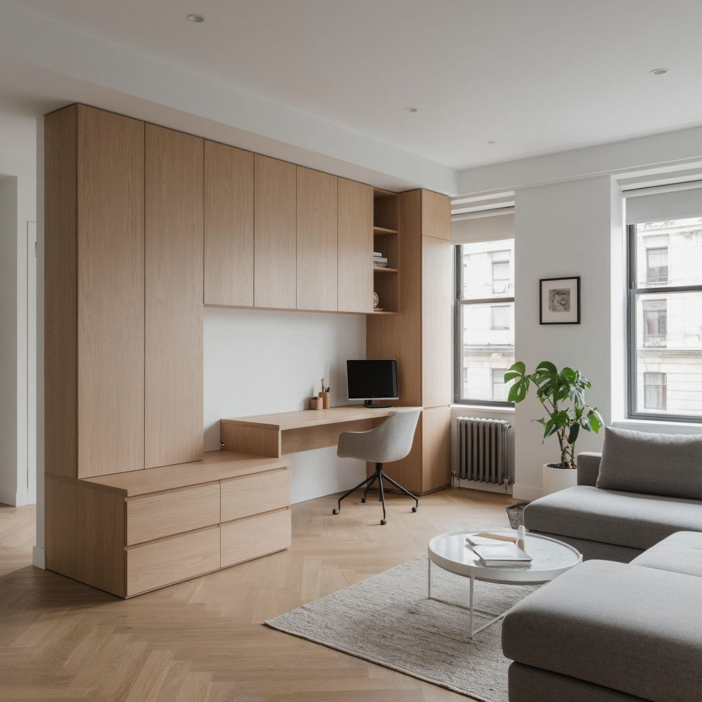 Такой симбиоз позволяет создавать по-настоящему индивидуальные решения. Для одного клиента мы добавляем в модульный комплект выдвижной письменный стол, который исчезает, когда не нужен. Для другого — интегрируем в общую композицию откидной обеденный стол для кухни-гостиной. Модули могут быть оформлены в едином стиле с фасадом кровати-трансформера — например, натуральным шпоном ясеня или матовой эмалью, — создавая безупречно целостный образ.