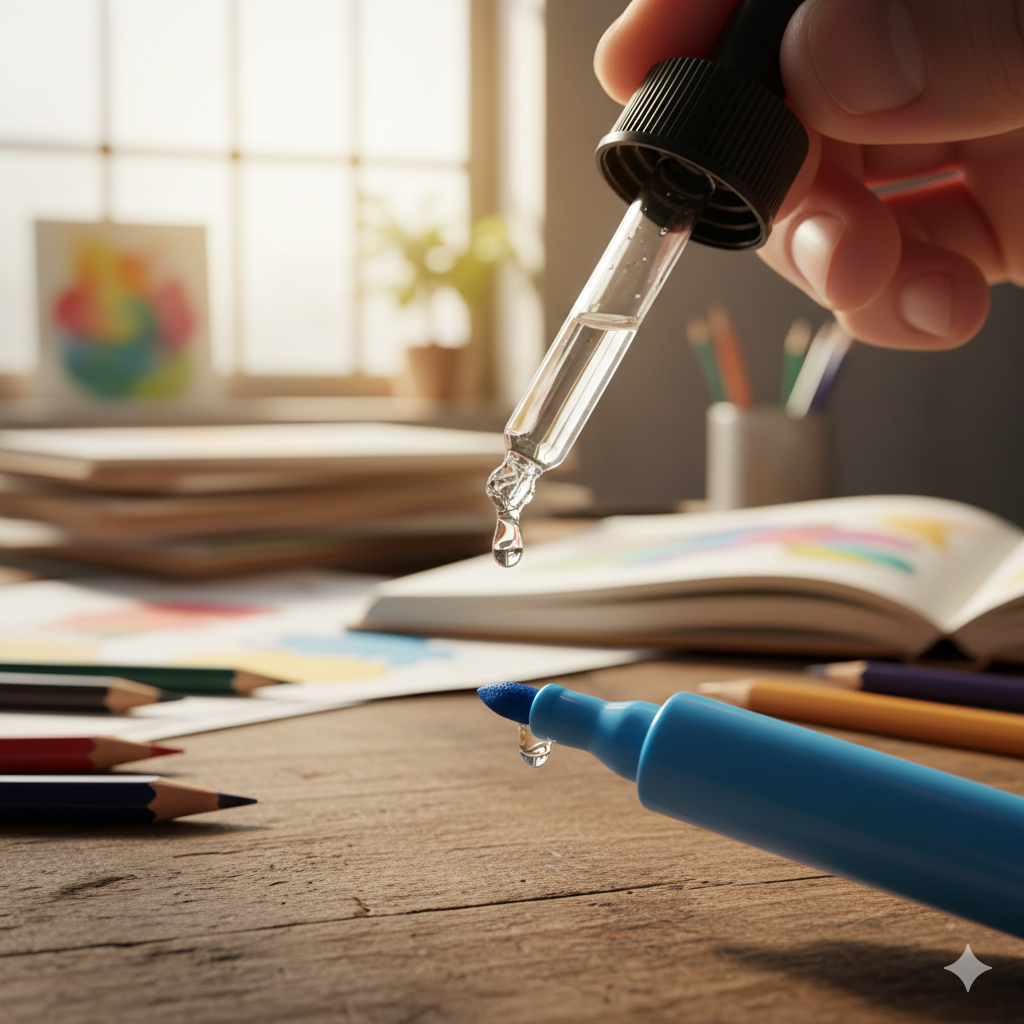 ## ОДНОЙ ЛЕВОЙ: Как оживить засохший фломастер Если любимый маркер или фломастер перестал писать в самый ответственный момент, не спешите его выбрасывать. Есть простой способ вернуть его к жизни, который спасёт ваши рисунки или важные заметки. **Что нужно сделать:** Снимите колпачок и капните буквально пару капель обычного спирта, духов или антисептика на кончик стержня. Закройте фломастер и дайте ему постоять в вертикальном положении (кончиком вниз) около 5–10 минут. Если фломастер на водной основе, вместо спирта используйте обычный столовый уксус. **Почему это работает:** Чернила внутри фломастера не заканчиваются мгновенно — чаще всего они просто засыхают у самого выхода, образуя «пробку». Спирт или уксус растворяют этот подсохший слой чернил и восстанавливают их текучесть, позволяя остаткам пигмента из глубины стержня снова поступать к кончику. **Лайфхак:** Чтобы фломастеры служили дольше, всегда храните их горизонтально. Так чернила распределяются равномерно и не скапливаются у од