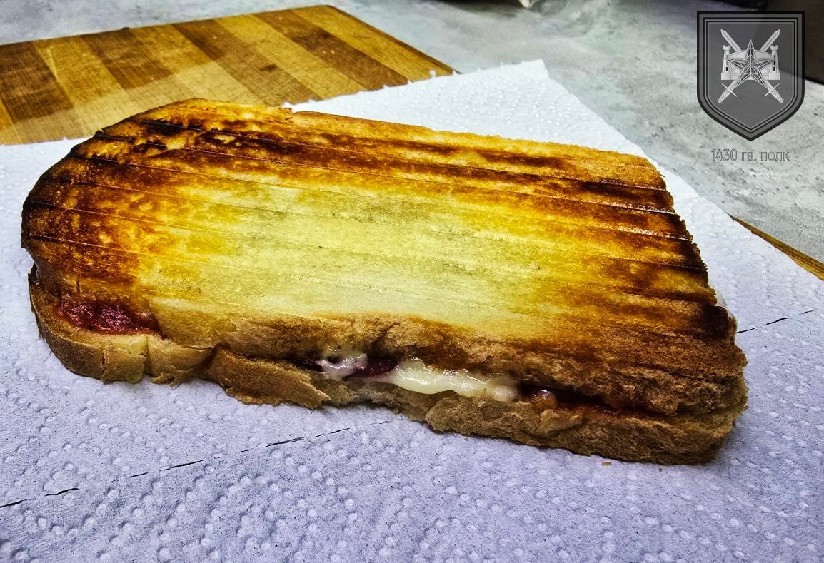 Этот аппетитный горячий сэндвич — результат кулинарной находчивости наших бойцов, сумевших приготовить достойное блюдо исключительно из уставных продуктов. Фото: боец 9 роты 1430 гвардейского полка Подписаться | Связаться с полком Служить в полку