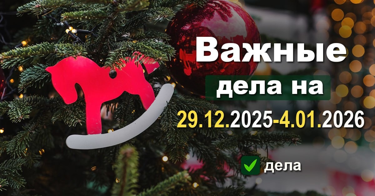 : 🎁 Докупить подарки близким и красиво их упаковать. 🎄 Украсить дом, участок и дачу. 🌲 Узнать, что нужно учесть, если Новый год встречаете на даче. 🍍 Составить праздничное меню. 🪅 Ждать чуда! Подробнее: https://www.dela.media/dela/vse/tekuschaya-nedelya?utm_source=telegram